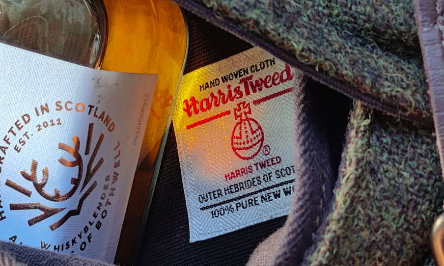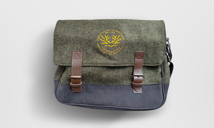A large shoulder bag made from Harris Tweed with canvas details and a back panel—ideal for laptops and notebooks—and two internal pockets and a top carry strap.